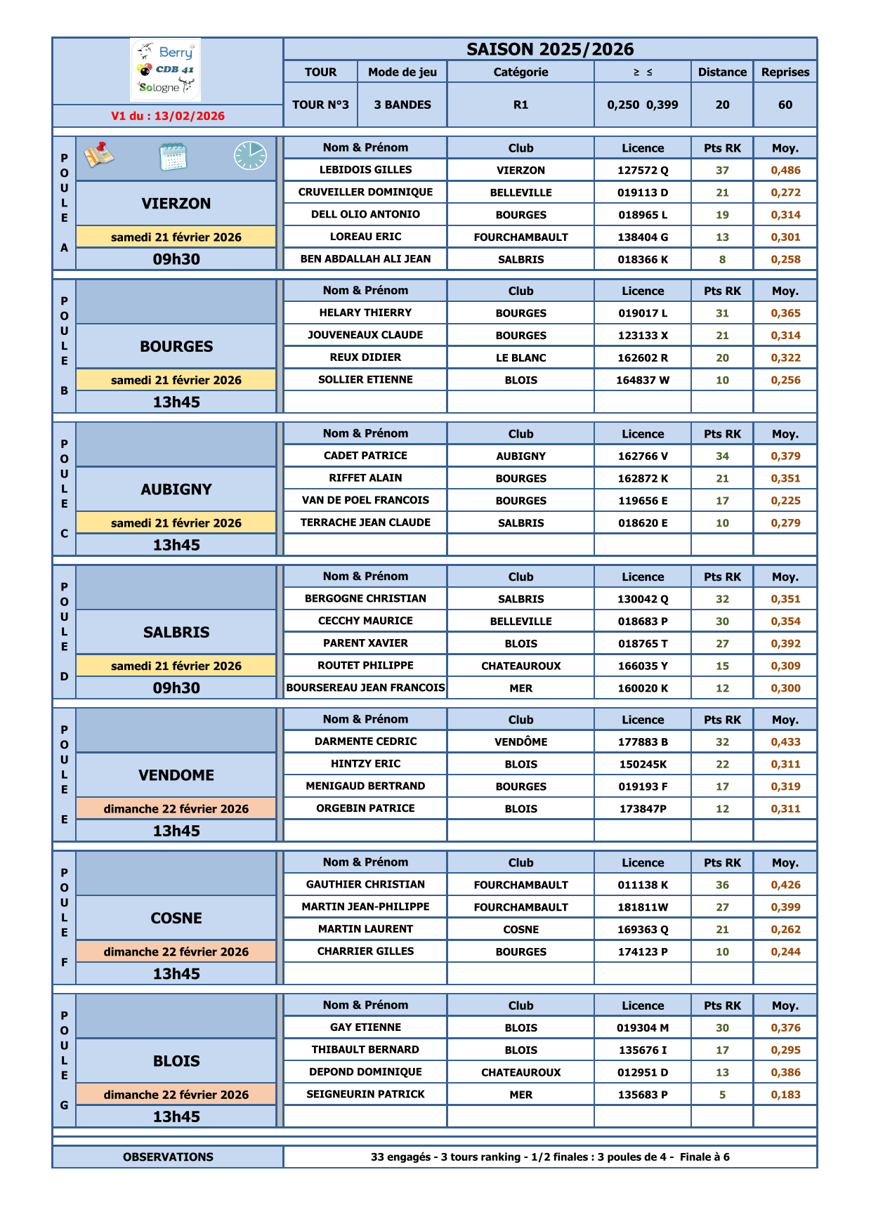 Dimanche 22 février 2026 à 13H45: 3 poule de 4 à BLOIS, VENDÔME et COSNE sur LOIRE.