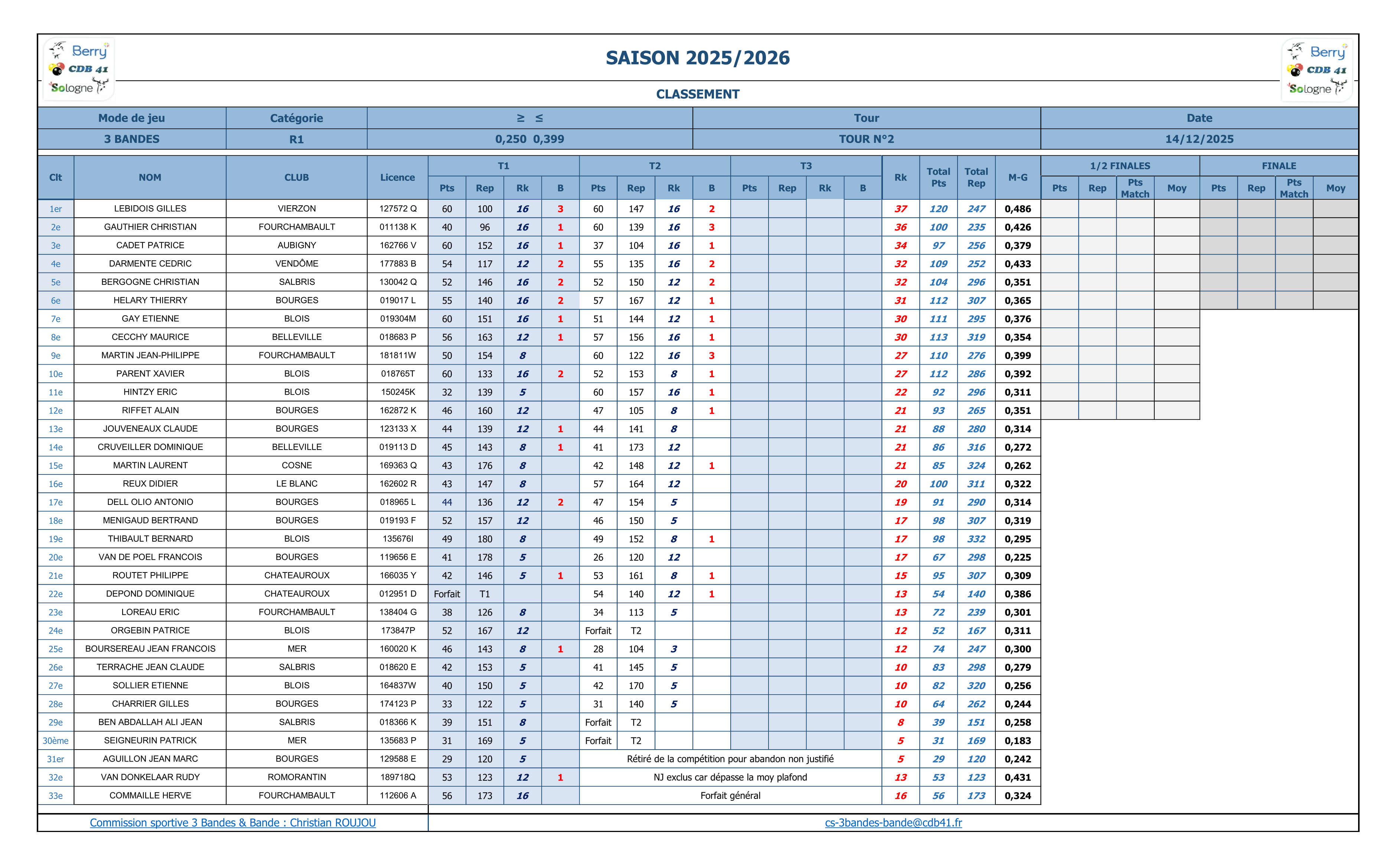 Meilleures performances du tour 1: Meilleure MG: 0.600 et meilleure MP: 0.833 pour LEBIDOIS Gilles de VIERZON. Meilleures performances du tour 2: Meilleure MG: 0.491 pour MARTIN Jean-Philippe de FOURCHAMBAULT.TOUR 1