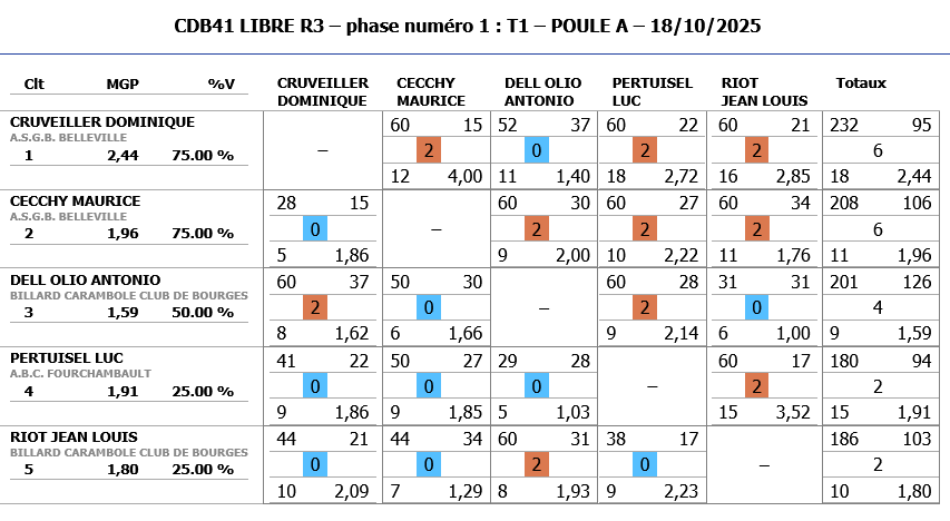 Meilleure MG: 2,44 et meilleure série:18 pour Dominique CRUVEILLER de BELLEVILLE.