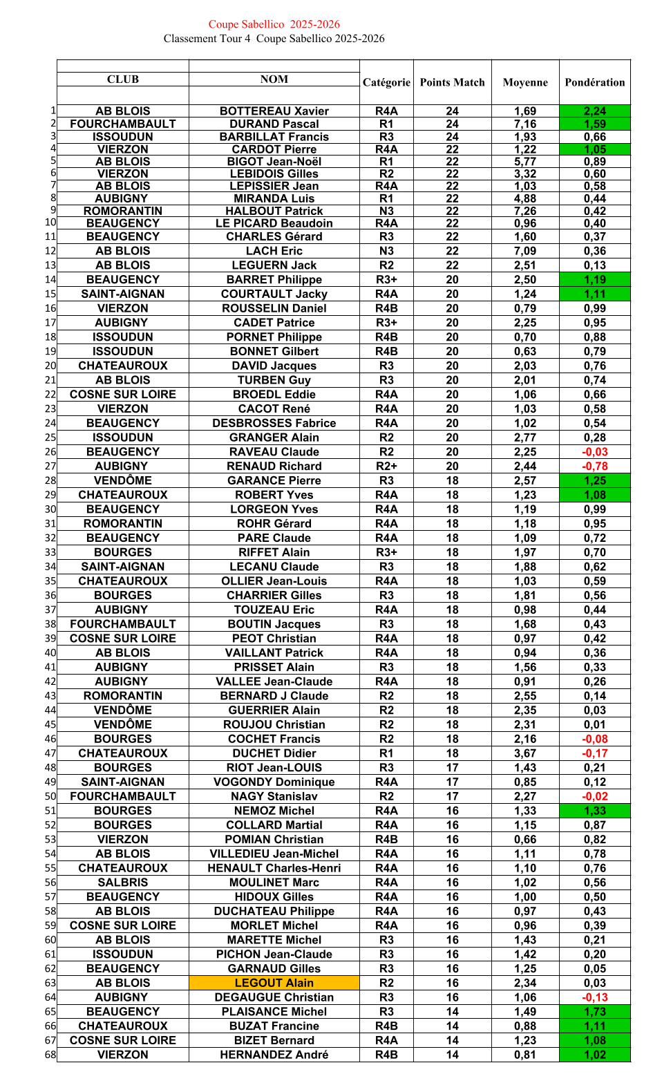 Ci-dessous le classement intermédiaire aprés le tour 4 et les resultats de ce tour 4 (à noter, il manque un résultat LEGOUT contre CRUCHET feuille non reçue).