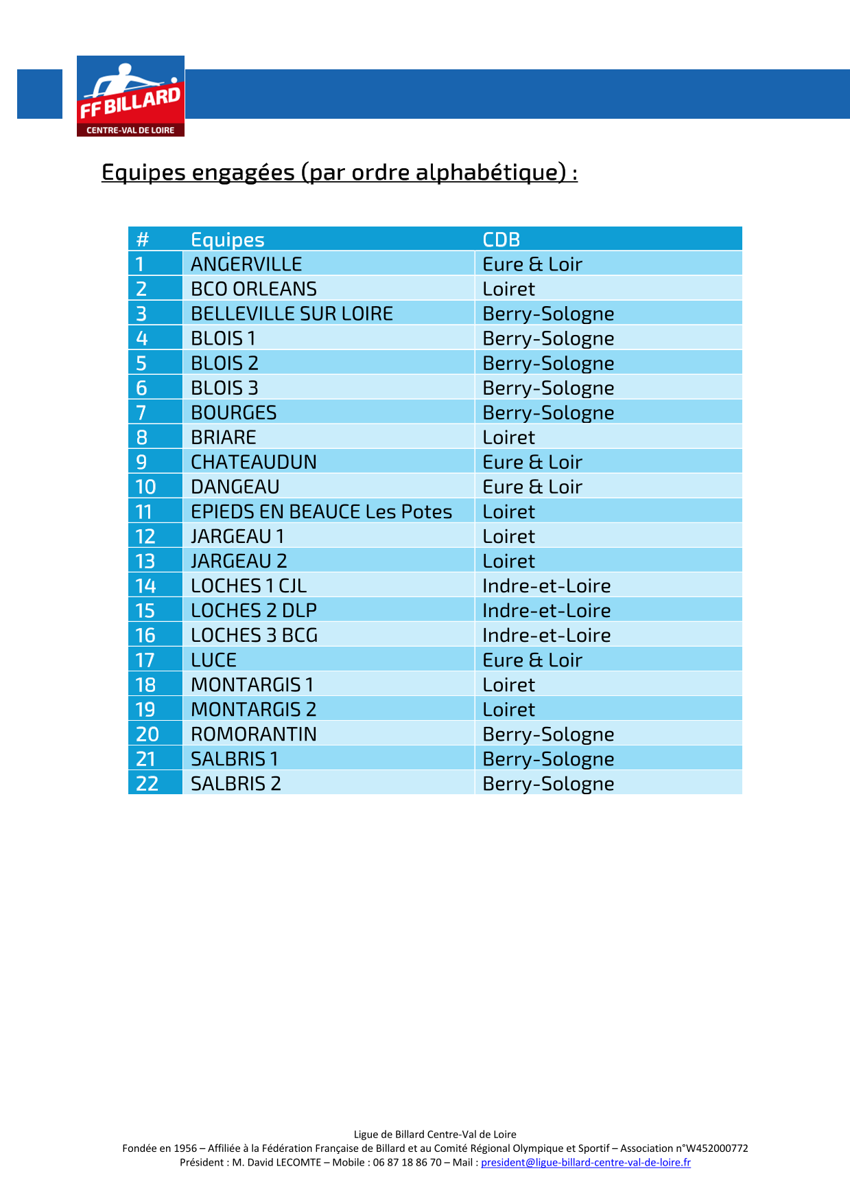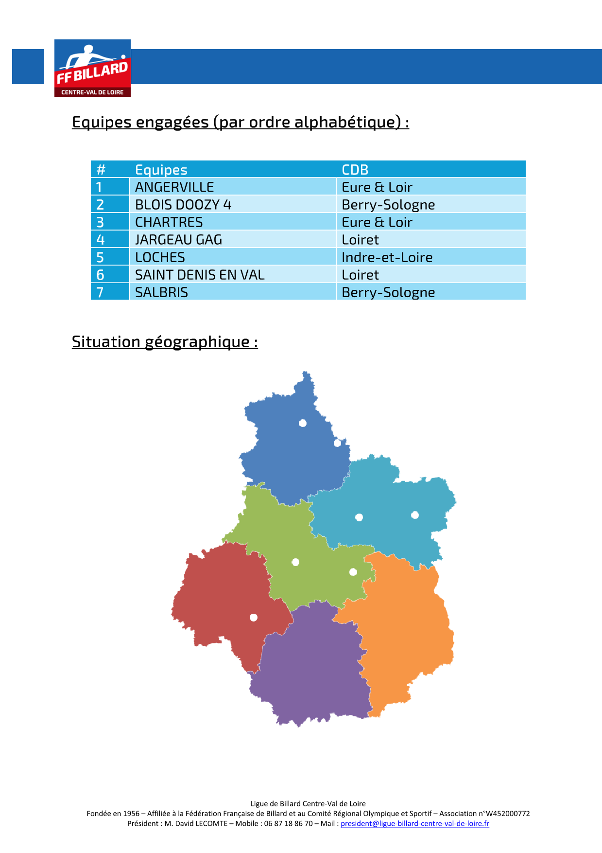 3 Bandes FEDERALE 5 : 22 équipes engagées dont 8 du CDB 41 (BELLEVILLE, BLOIS1, BLOIS 2, BLOIS 3, BOURGES, ROMORANTIN, SALBRIS 1 et SALBRIS 2) => J1 le 11/10/2025 à MONTARGIS, LOCHES, BOURGES et BELLEVILLE.