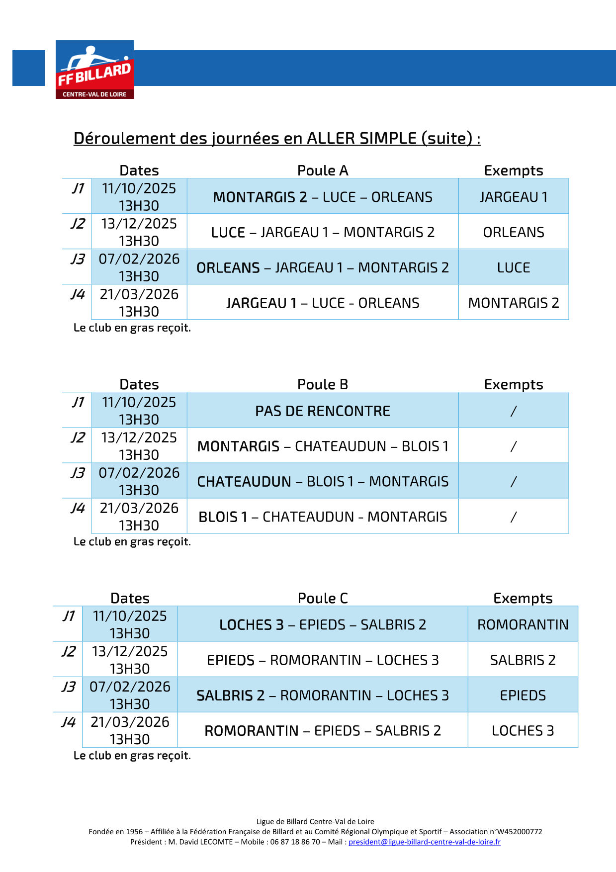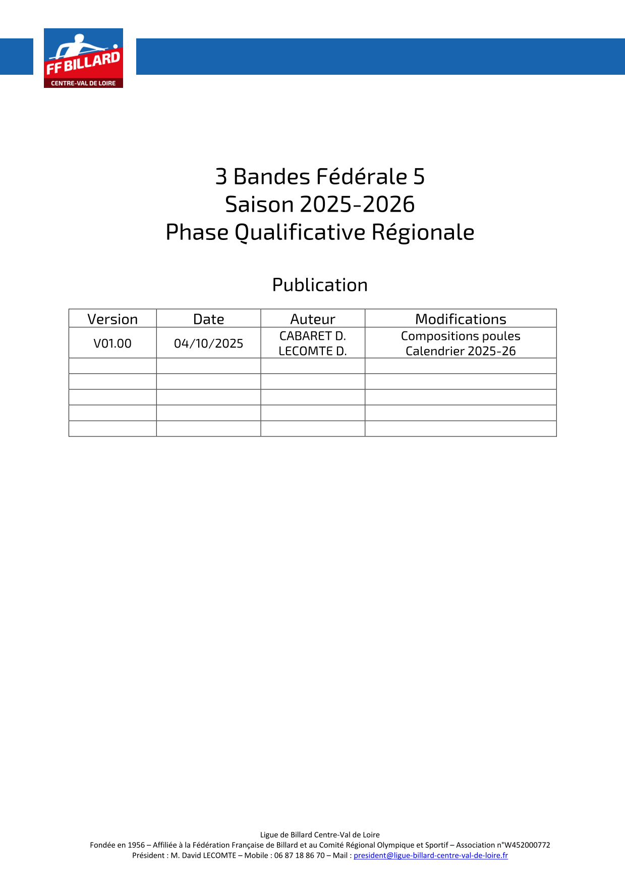 Retrouvez ci-dessous les calendriers version 1 des équipes du 3 Bandes FEDERALES 4 et 5 2025/2026