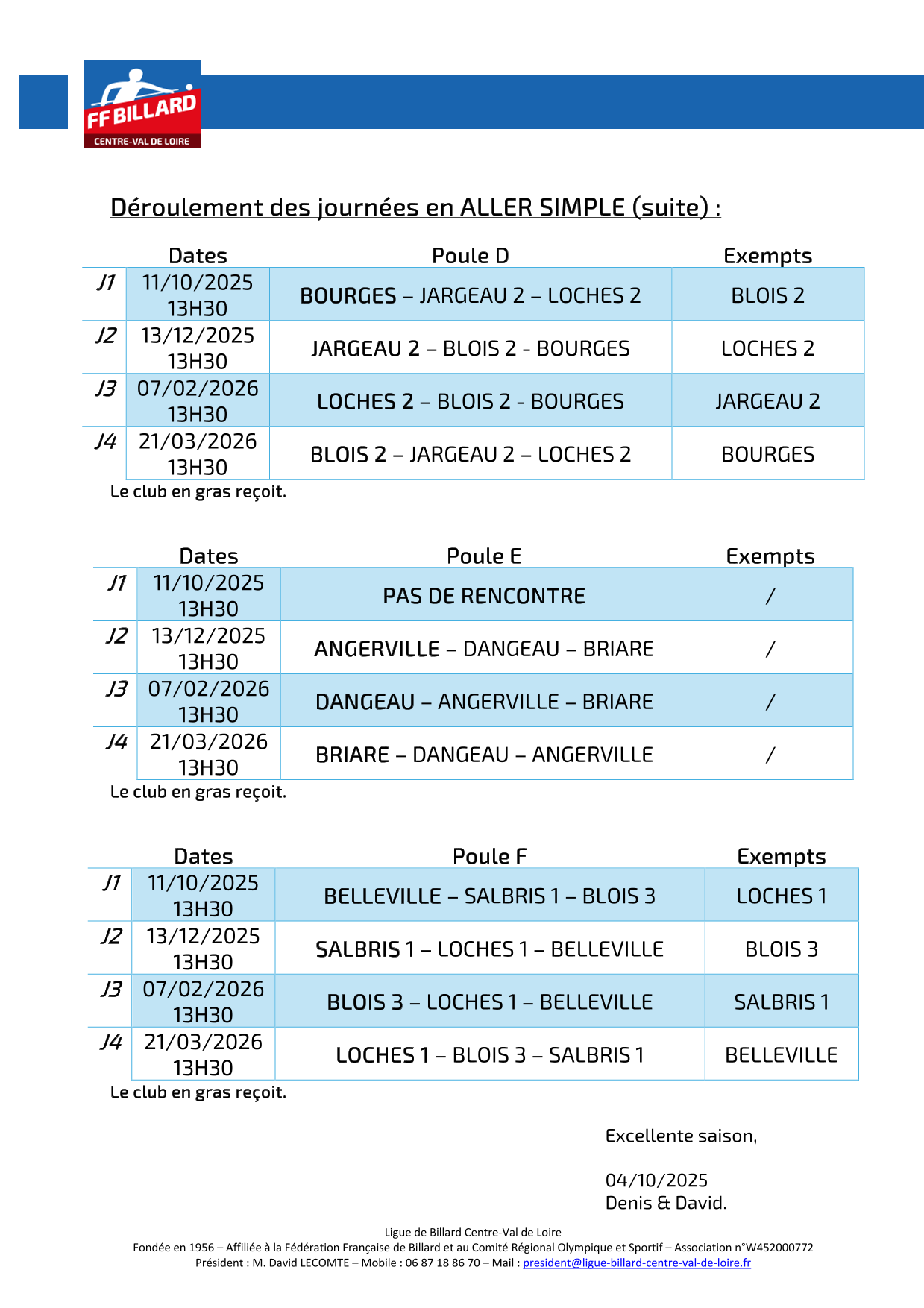 3 Bandes FEDERALE 4 : 7 équipes engagées dont 2 du CDB 41 (SALBRIS et BLOIS DOOZY 4) => J1 le 18/10/2025 à ANGERVILLE et LOCHES.