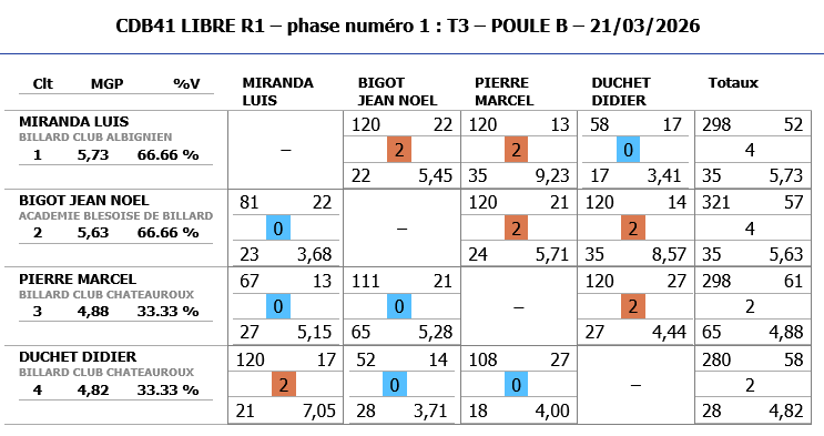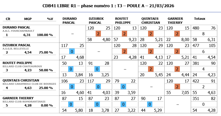 Meilleures performances du tour 1: Meilleure MG: 8.00 pour DURAND Pascal de FOURCHAMBAULT. Meilleures performances du tour 2: Meilleure MG: 6.05 pour GARNIER Thierry de ROMORANTIN. Meilleures performances du tour 3: Meilleure MG: 6.31 pour DURAND Pascal de FOURCHAMBAULT.TOUR 1