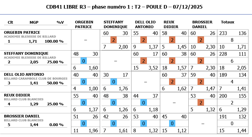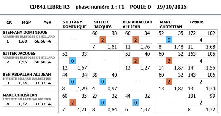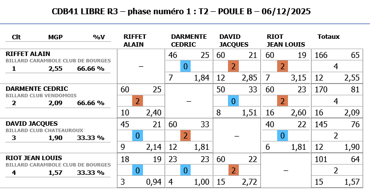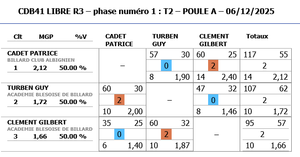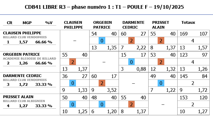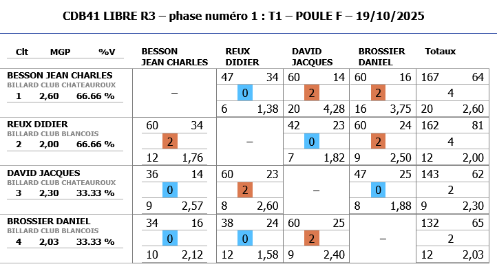 A noter également les bonnes performances de Jeaan-Charles BESSON de CHATEAUROUX (nouveau joueur) qui malheureusement dépassent les limites de la catégorie R3 et ne peut continuer dans cette compétition.