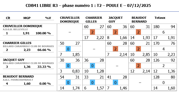 Meilleure MG: 2,44 et meilleure série:18 pour Dominique CRUVEILLER de BELLEVILLE.