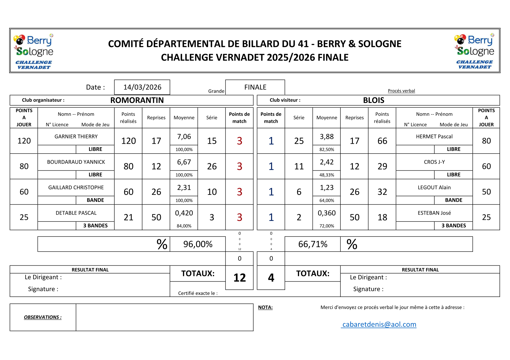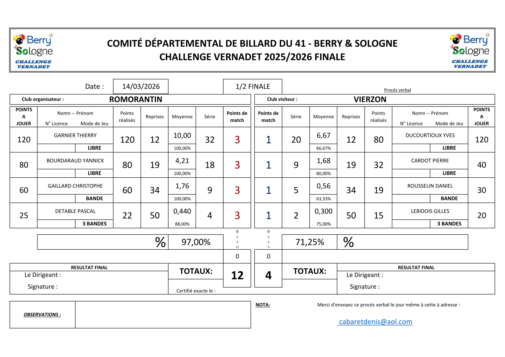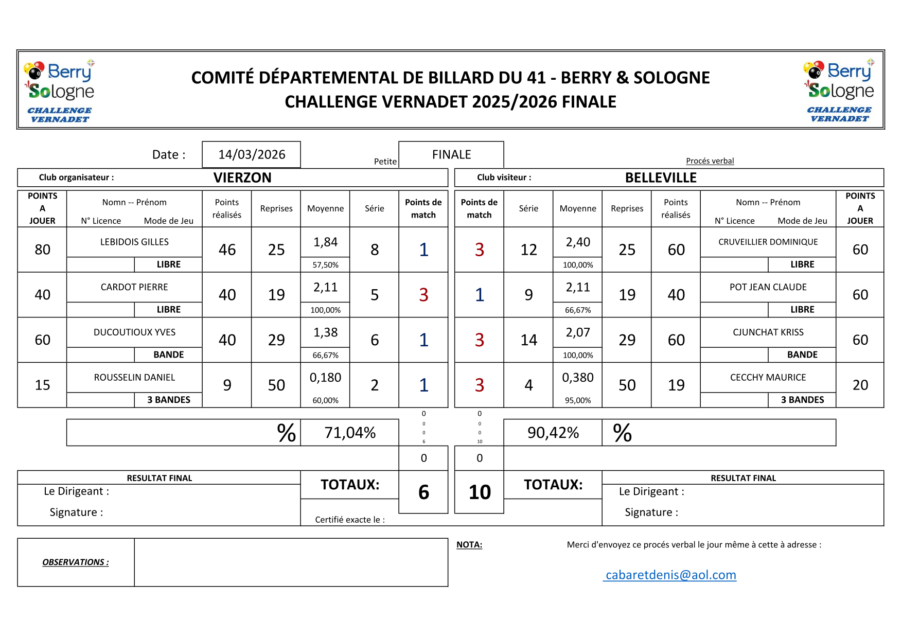 Suite au forfait d'AUBIGNY, le Billard Club de VIERZON complètera  cette finale le samedi 14/03/2026.