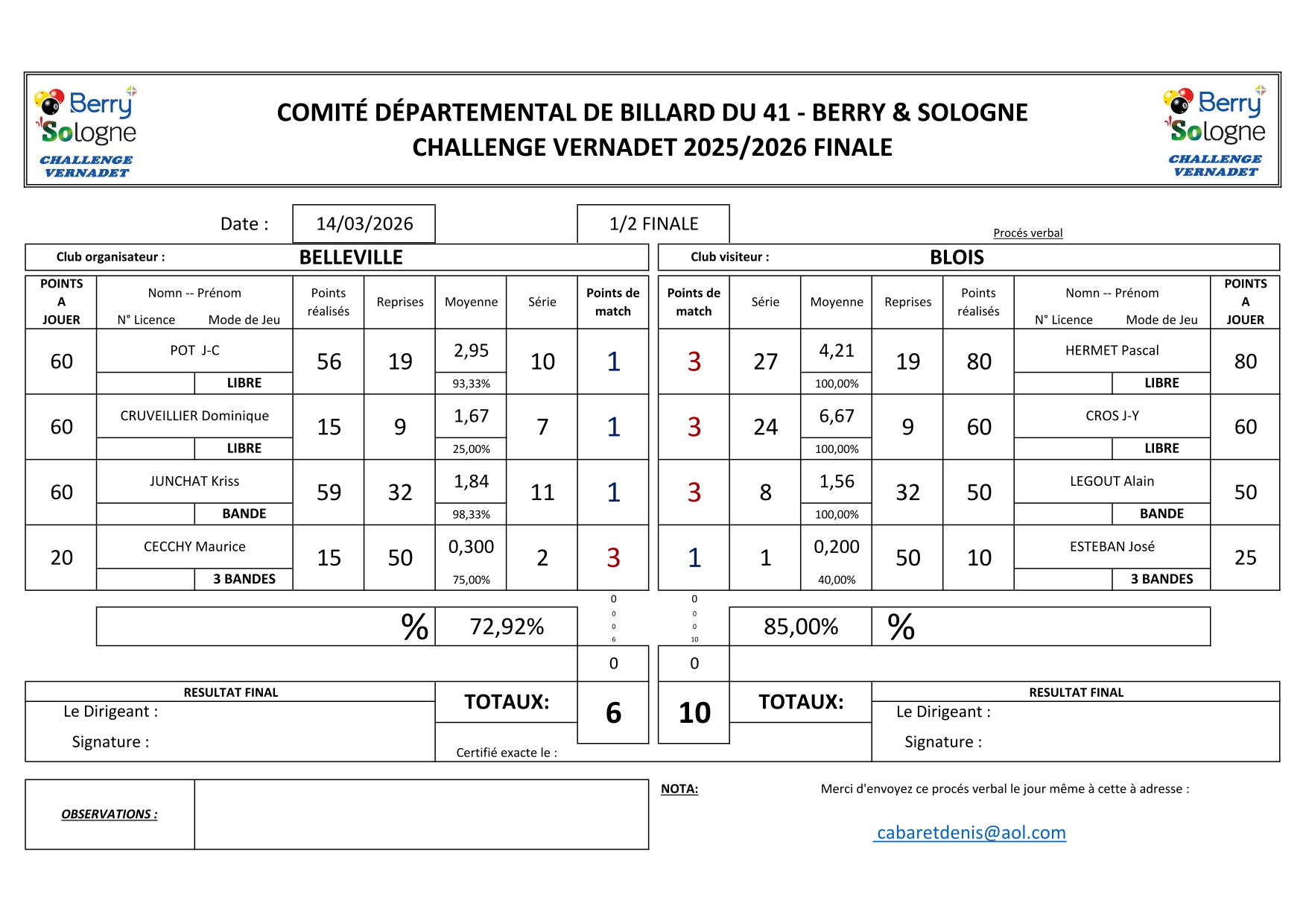 - La rencontre  de classement pour la 3° place qualificative pour le Challenge FOULON fût remportée par BELLEVILLE 10/6 face à VIERZON.