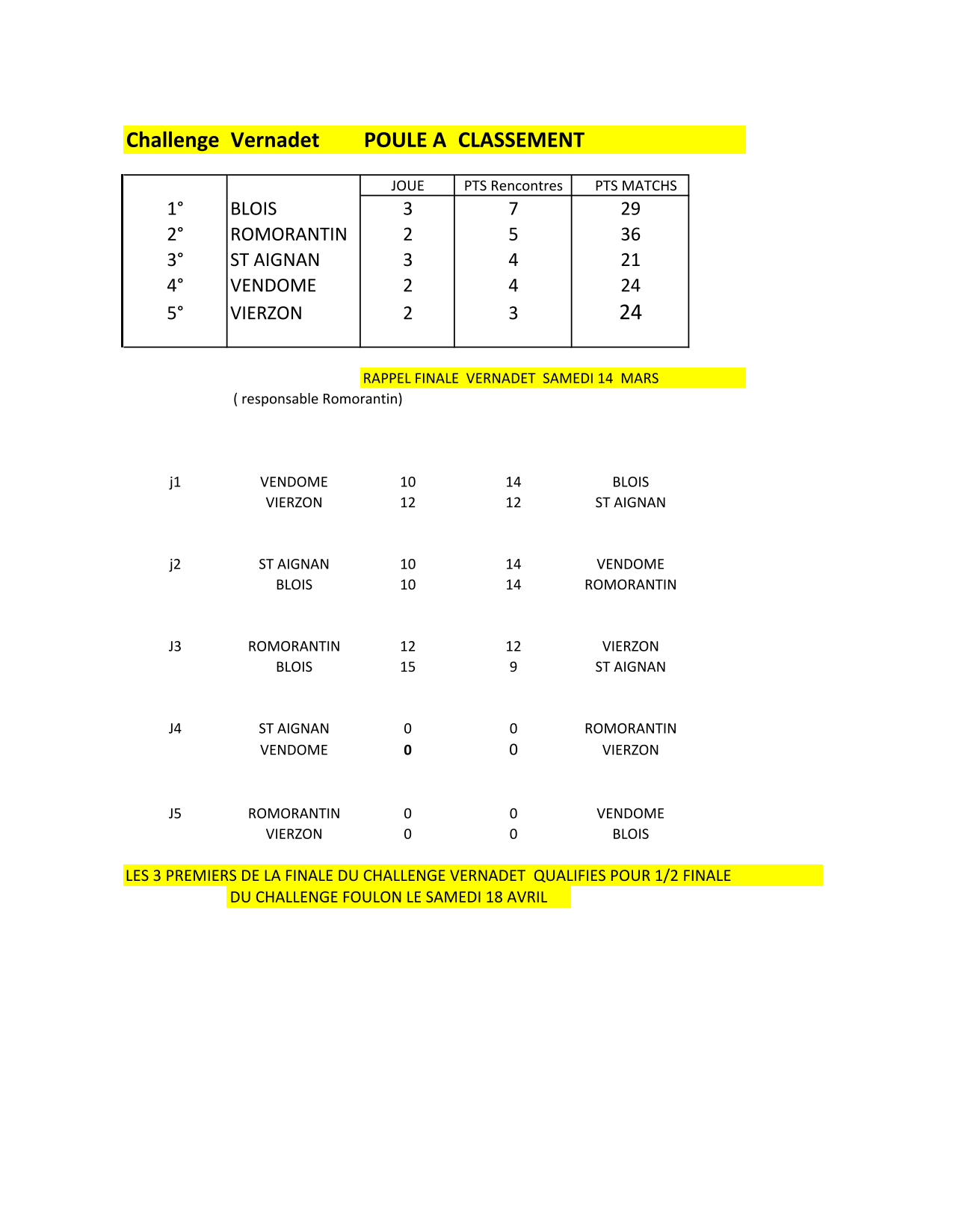 Les deux pemiers de chaque poule qualifiés pour la finale VERNADET à 4 joueurs le samedi 14 mars.